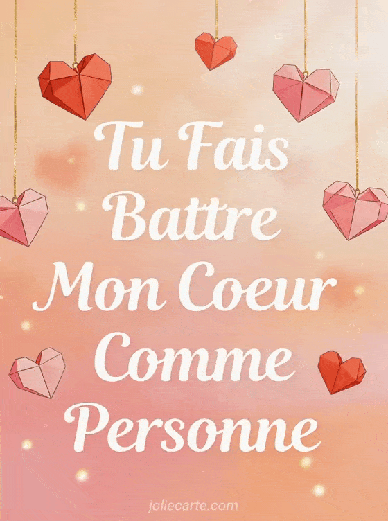 Offrez ce texte d'amour « Tu Fais Battre Mon CĆur Comme Personne » avec des cĆurs en origami suspendus. Voyez aussi un je t'aime trĂšs fort, un couple romantique ou un amour infini.