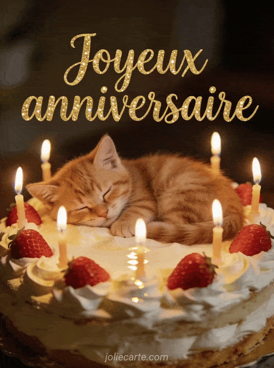 Envoyez ce joyeux anniversaire à une jeune fille avec son chaton roux endormi sur un gùteau aux fraises. Une image douce et attendrissante. Découvrez aussi un anniversaire poétique, un anniversaire humour ou un anniversaire tendre.