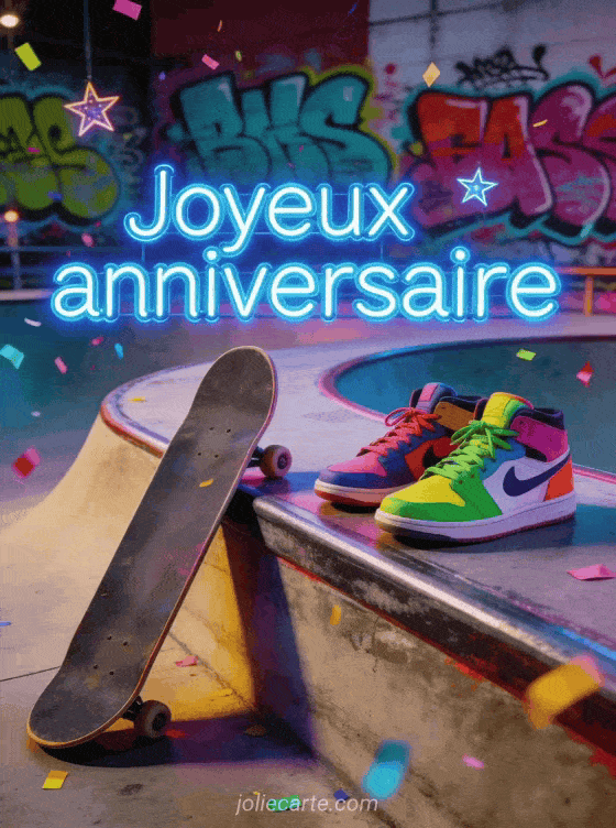 Souhaitez un joyeux anniversaire à un garçon avec cette image animée dynamique et urbaine, parfaite pour un jeune plein d'énergie. Découvrez aussi une carte anniversaire 1 an animée, un anniversaire animé ou une carte virtuelle anniversaire animée gratuite.