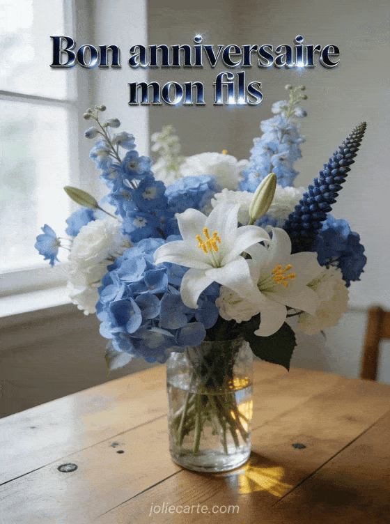 Marquez l'anniversaire de votre fils avec cette image Ă©lĂ©gante aux tons bleus et blancs. Un bouquet raffinĂ© pour accompagner vos vĆux les plus sincĂšres. Voir aussi un texte touchant pour votre fils ou une carte festive pour fils adulte.