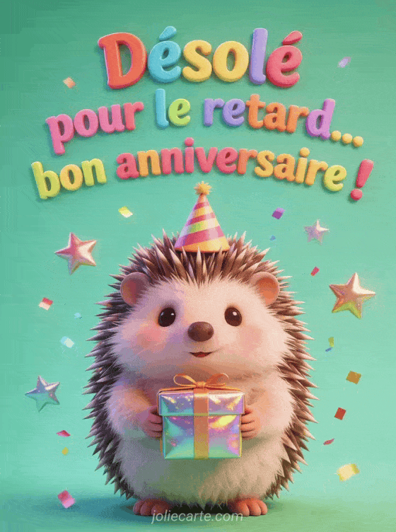 Ce petit hĂ©risson en chapeau de fĂȘte rattrape l'oubli avec un cadeau et beaucoup de bonne humeur. Parfait pour un bon anniversaire en retard. DĂ©couvrez aussi un joyeux anniversaire retard drĂŽle, une carte retard humoristique ou un bon anniversaire tardif.