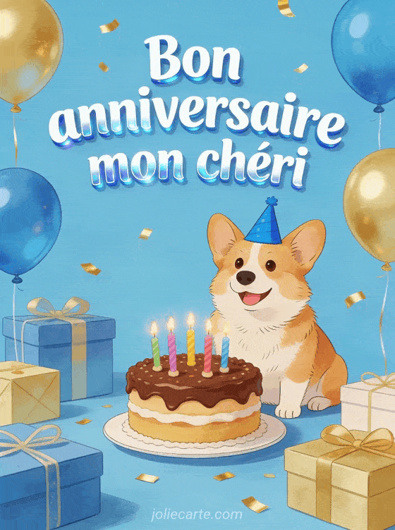 Envoyez un bon anniversaire joyeux à votre chéri avec cette carte au corgi irrésistible. Découvrez aussi un bon anniversaire ma chérie, une carte anniversaire amoureux ou un anniversaire romantique.