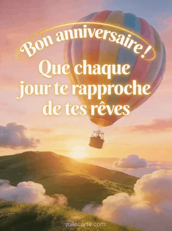 Souhaitez un bon anniversaire inspirant à votre belle-fille. Une montgolfière dans un ciel doré pour un message plein d'espoir. Voir aussi une carte colorée, un texte automnal ou un jardin secret.