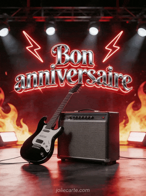 Souhaitez un bon anniversaire rock n roll avec cette carte gratuite survoltée, parfaite pour les fans de musique et d'énergie. Découvrez aussi un bon anniversaire avec un chat, un bon anniversaire femme ou un bon anniversaire en gif pour femme.