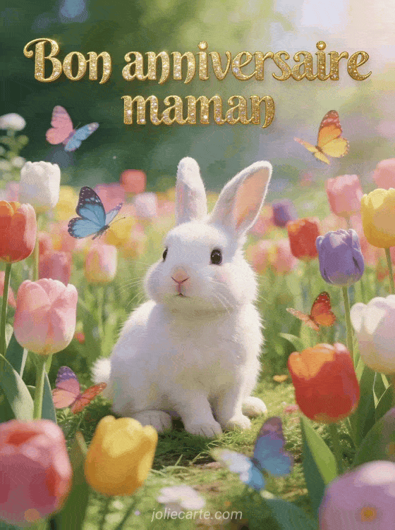 Faites sourire votre maman avec cette illustration printaniĂšre d'un lapin parmi les tulipes. Voir aussi un anniversaire fleuri, un texte pour maman ou un message touchant.