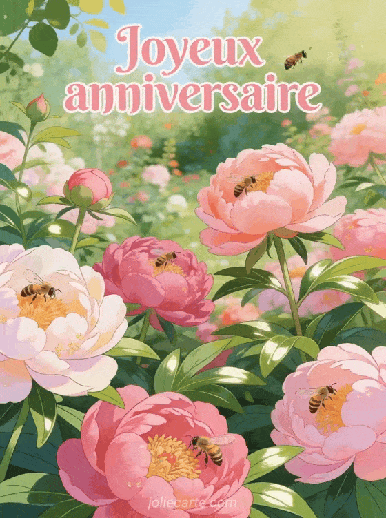 Joyeux anniversaire un jardin de pivoines luxuriantes butinées par les abeilles