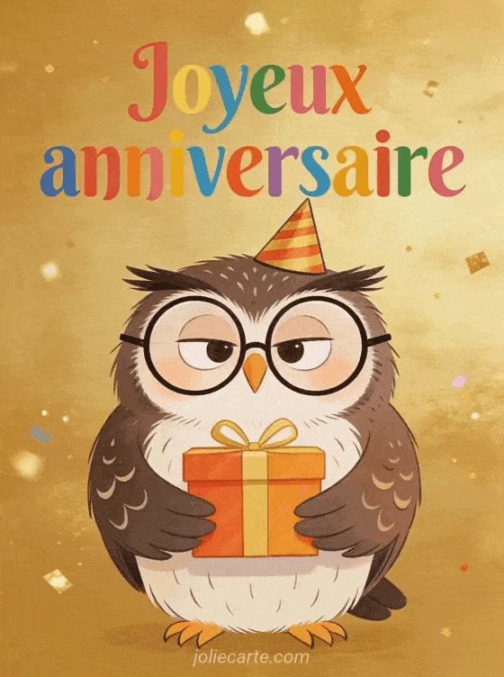 Envoyez cette carte amusante avec sa chouette à lunettes et son cadeau pour un anniversaire qui fait sourire. Voyez aussi une carte iris violets, un anniversaire coucher de soleil ou un anniversaire écureuil.