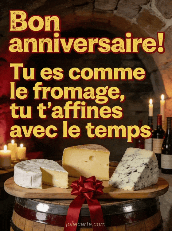 Envoyez cette carte anniversaire humour à un homme qui s'affine avec le temps comme un bon fromage. Pour d'autres idées, découvrez une image anniversaire humour, une carte humour citation anniversaire ou un gif animé anniversaire humour.