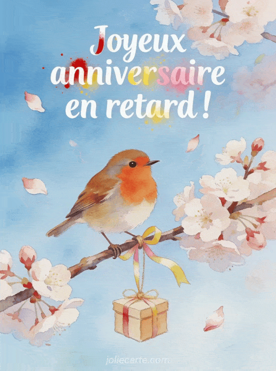 Ce rouge-gorge sur une branche de cerisier apporte un joyeux anniversaire en retard plein de charme. Carte gratuite à télécharger. Voir aussi une jolie carte retard fleurie, un retard tonton festif ou un retard colibri tropical.