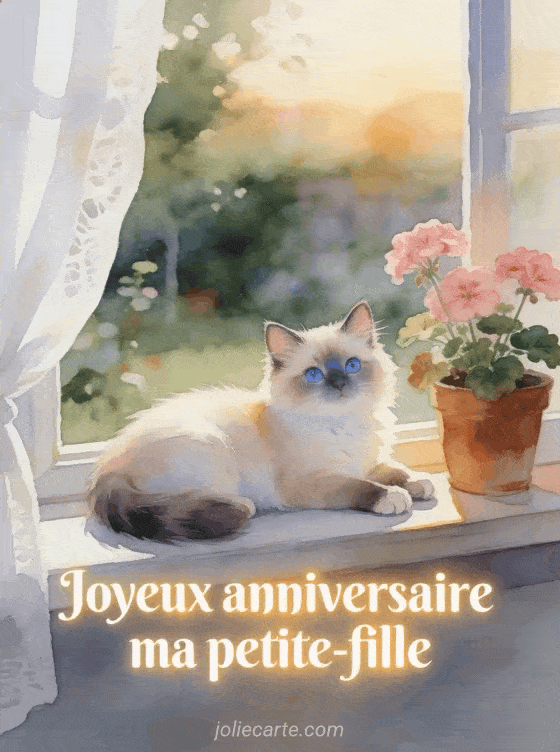 Offrez cette carte d'anniversaire douce à votre petite-fille avec son chat ragdoll et ses géraniums. Voir aussi une carte souhaiter, un anniversaire grands-parents ou un gif bon anniversaire.