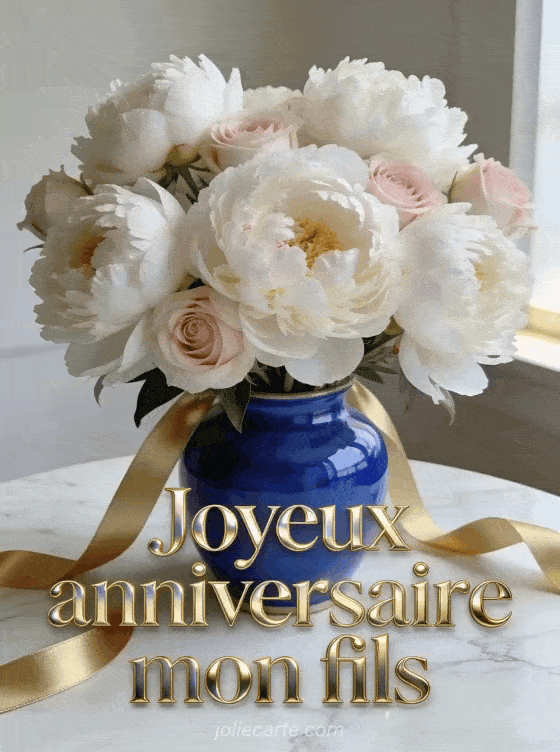 Souhaitez un joyeux anniversaire à votre fils avec cette carte élégante ornée de pivoines. Un visuel chic pour un message plein de tendresse. Voir aussi une lettre d'anniversaire, un poÚme pour votre fils ou une image festive.