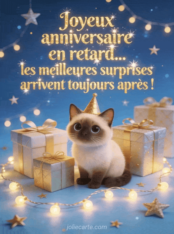Ce chat siamois entouré de cadeaux apporte un joyeux anniversaire en retard plein de surprises. Carte virtuelle gratuite. Voir aussi un retard amour romantique, un poÚme retard nocturne ou un gif retard hérisson.