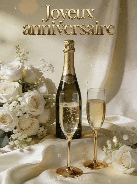 Célébrez avec cette image de champagne et roses blanches sur nappe satinée pour un anniversaire féminin festif. Voyez aussi une cybercarte colibri, une image roses David Austin ou un anniversaire ours.