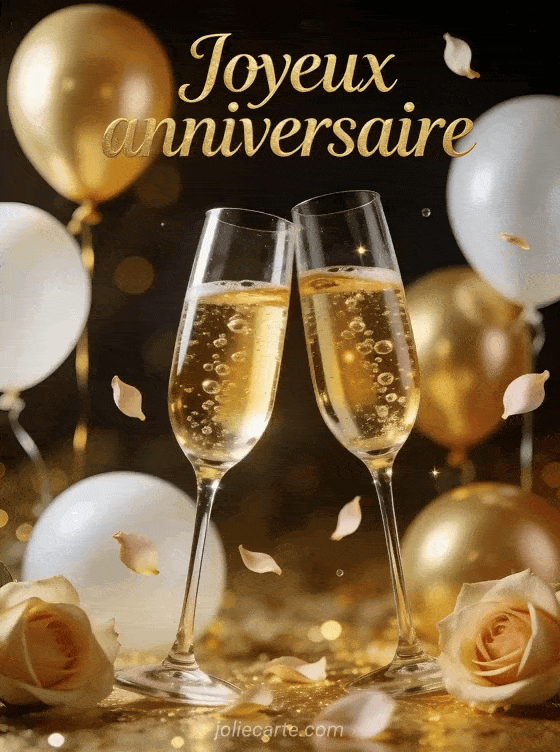 Célébrez avec ces coupes de champagne trinquant sous les ballons dorés pour un anniversaire féminin festif. Voyez aussi un jardin enchanté, un bouquet et ballons ou un gif hérisson.