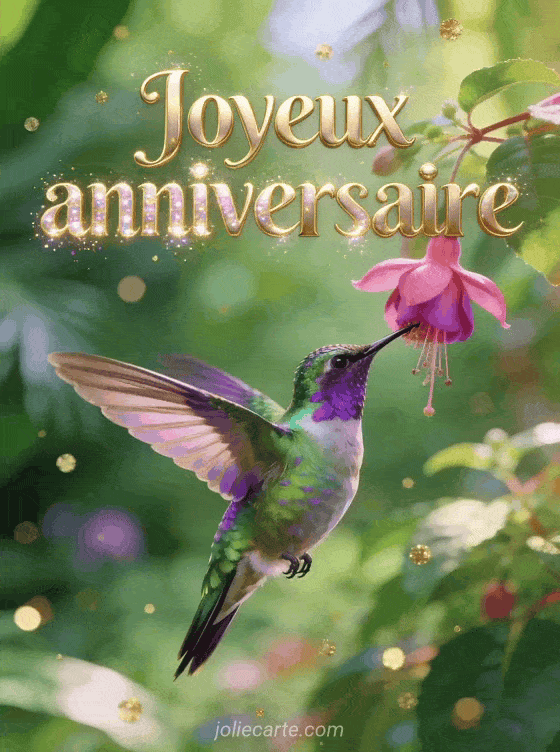 Joyeux anniversaire un colibri irisé butinant une fleur de fuchsia