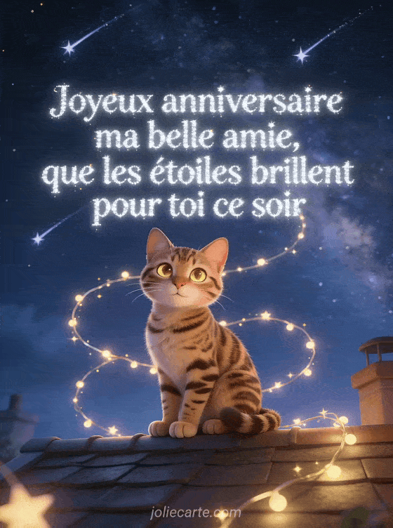 Offrez cette carte d'anniversaire étoilée à votre amie avec son chat bengal sous la voie lactée. Voyez aussi un anniversaire amie de cœur, un bon anniversaire amie femme ou un message anniversaire amie femme.