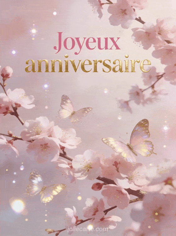 Envoyez cette carte animée avec ses papillons virevoltant parmi les fleurs de cerisier pour un anniversaire féminin plein de grùce. Découvrez aussi une image anniversaire gourmande, une carte lavande ou un anniversaire champagne.