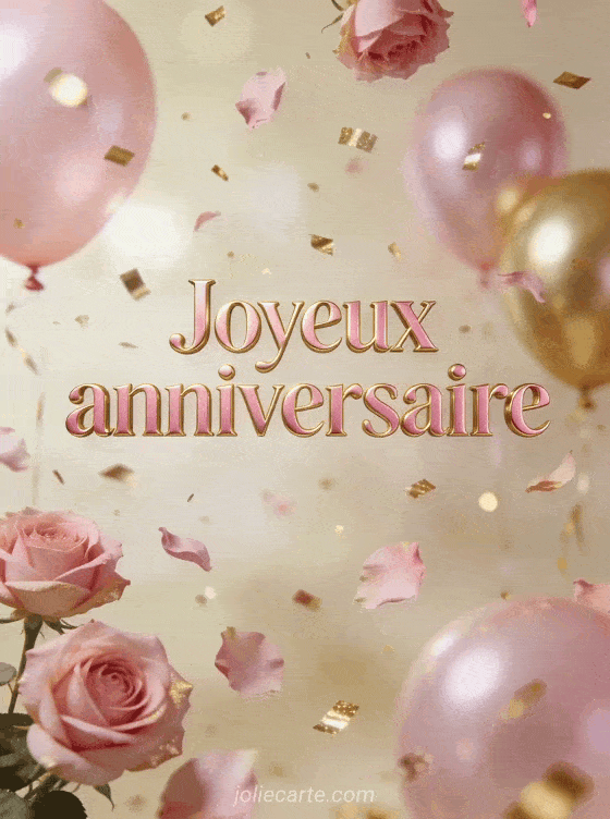 Partagez ce gif festif de confettis dorés et pétales roses tombant en pluie pour un anniversaire éclatant. Découvrez aussi une couronne de fleurs, une carte pivoines ou un proverbe inspirant.