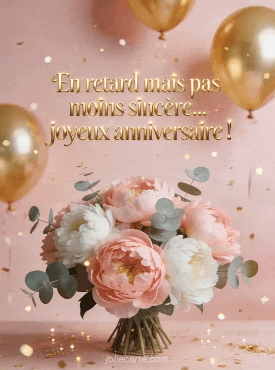 Cette composition de pivoines et ballons dorĂ©s accompagne vos vĆux d'anniversaire en retard avec Ă©lĂ©gance. Parfait pour rattraper le coup. Voir aussi une carte retard mignonne, un message retard touchant ou un anniversaire tardif fleuri.