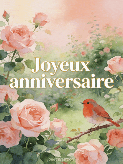 Partagez cette illustration aquarelle d'un jardin de roses avec un rouge-gorge pour un anniversaire plein de charme. Voyez aussi une image tulipes, un gif papillons ou une image gourmande.