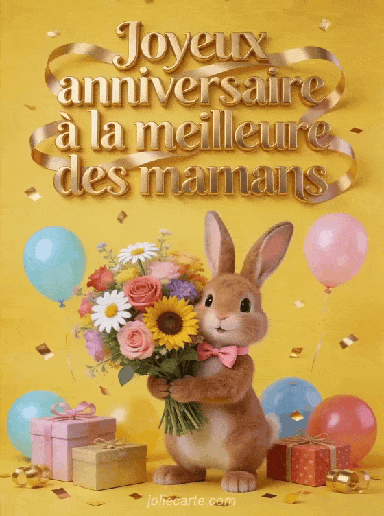 Dites à votre maman qu'elle est la meilleure avec ce lapin festif portant un bouquet coloré parmi ballons et cadeaux. Voir aussi un bouquet de fleurs, un poÚme illustré ou un anniversaire future maman.