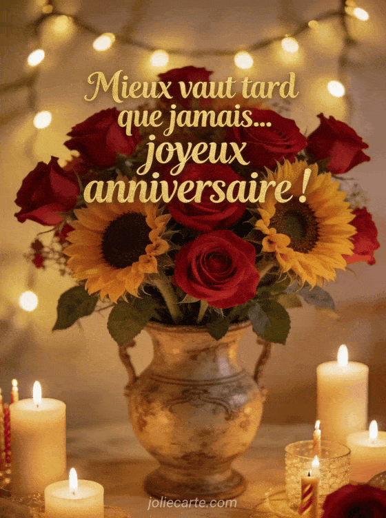 Rattrapez l'anniversaire oubliĂ© avec cette carte Ă©lĂ©gante mĂȘlant roses et tournesols. Une touche d'humour pour des vĆux tardifs rĂ©ussis. Voir aussi une carte retard humoristique, un bon anniversaire tardif ou un joyeux anniversaire en retard.