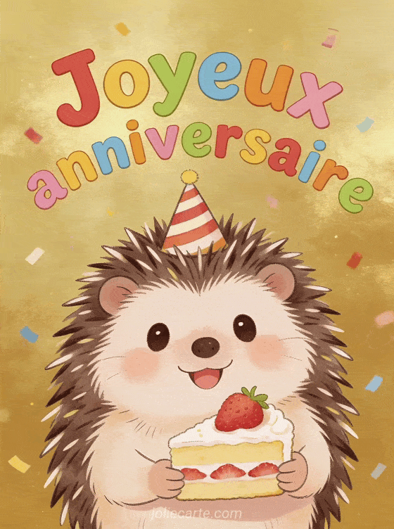 Faites sourire avec ce hĂ©risson coiffĂ© d'un chapeau de fĂȘte et sa part de gĂąteau aux fraises. Voyez aussi un gif cĆurs dorĂ©s, un anniversaire entre amies ou une carte renoncules.