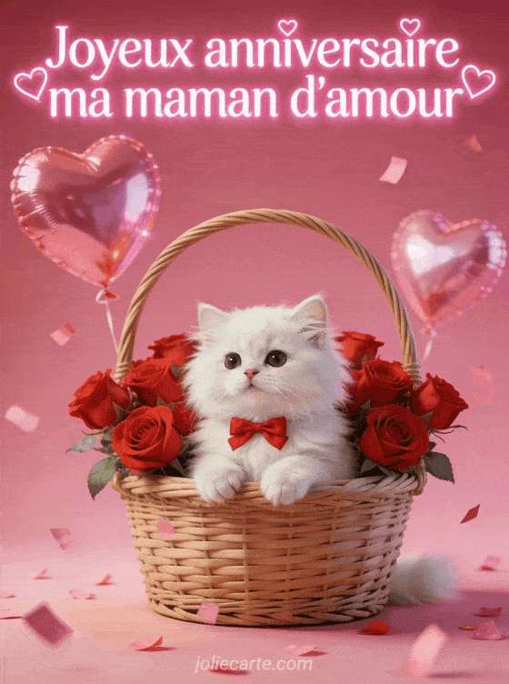 FĂȘtez votre maman d'amour avec ce chaton persan dans un panier de roses et ballons en cĆur. Voir aussi un texte fleuri, un anniversaire papa et maman ou un anniversaire future maman.