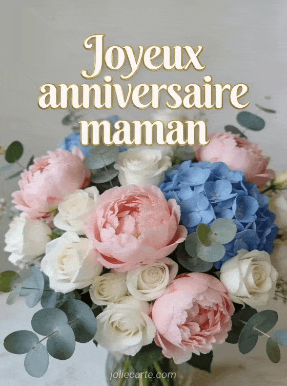 Célébrez votre maman avec cette image d'anniversaire ornée de pivoines, roses et hortensias. Découvrez aussi un texte pour maman, un message émouvant ou une carte illustrée.