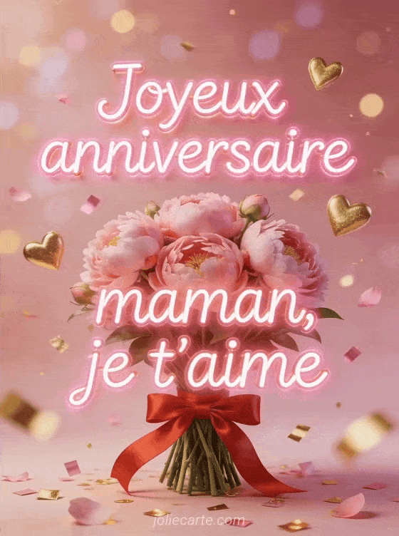 FĂȘtez votre maman avec cette carte d'anniversaire pleine d'amour, pivoines roses et cĆurs dorĂ©s flottants. Voir aussi un dessin joyeux, une carte belle-maman ou un texte pour maman ĂągĂ©e.