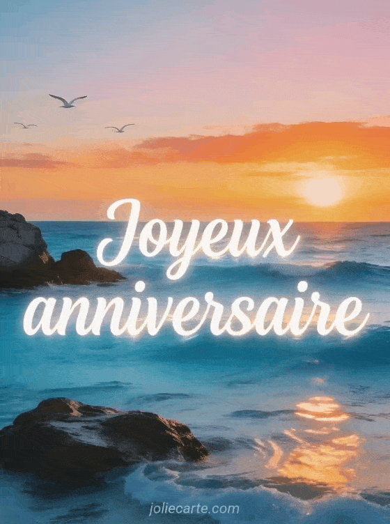 Souhaitez un joyeux anniversaire avec cette image apaisante de mer bleu azur au coucher du soleil. Découvrez aussi un gros bouquet joyeux anniversaire fleurs, un joyeux anniversaire fleurs des champs ou une image joyeux anniversaire avec des fleurs.
