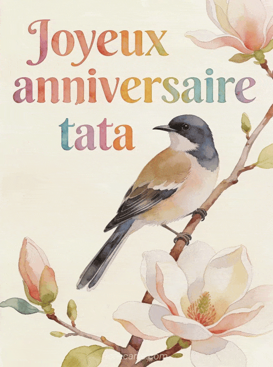Offrez un joyeux anniversaire à votre tata avec ce dessin au style aquarelle raffiné. Pour compléter votre attention, découvrez aussi une joyeux anniversaire tatie en image, un joyeux anniversaire tata gif ou un joyeux anniversaire tatie.