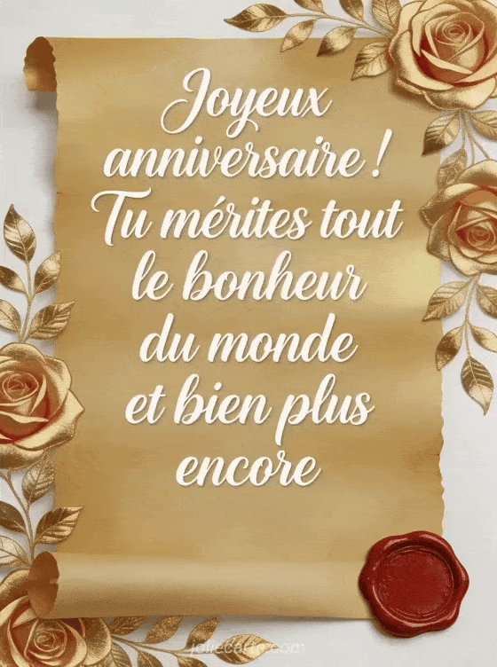 Envoyez une lettre pour souhaiter un joyeux anniversaire avec ce message touchant et personnel sur fond de parchemin doré. Découvrez aussi un joyeux anniversaire chic, un joyeux anniversaire hivernal ou un joyeux anniversaire chien.