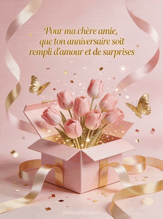 Surprenez votre amie avec ce message d'anniversaire festif et cette boîte cadeau pleine de tulipes. Découvrez aussi un joyeux anniversaire amie proche, un texte anniversaire amitié ou un texte anniversaire amis.