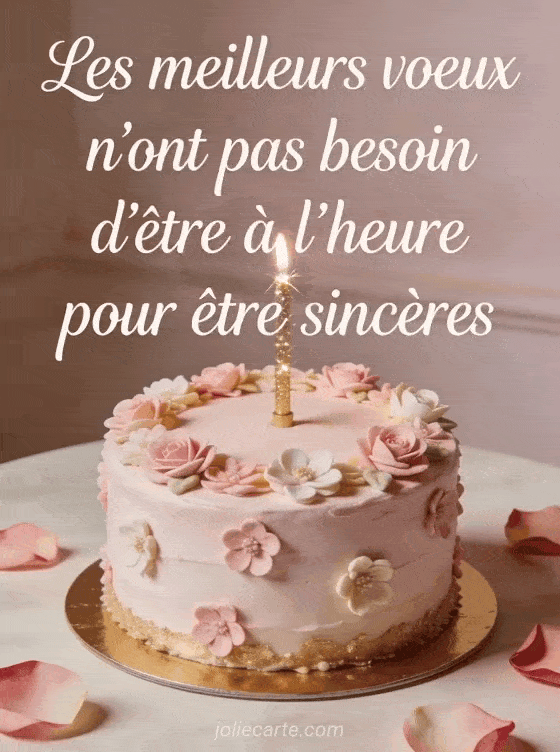 Ce gĂąteau rose ornĂ© de fleurs en sucre accompagne un message d'anniversaire en retard plein de sincĂ©ritĂ©. Des vĆux tardifs mais touchants. Voir aussi un anniversaire tardif fleuri, un anniversaire retard animĂ© ou un retard humoristique.