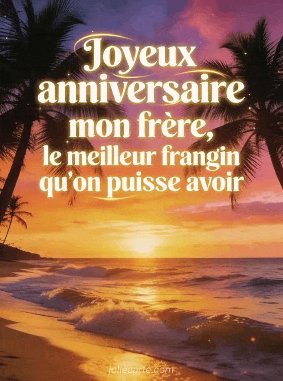 Offrez à votre frère un anniversaire grandiose avec cette carte sur fond de coucher de soleil océanique. Découvrez aussi un anniversaire beau-frère drôle, un bon anniversaire beau-frère ou une carte anniversaire frère.