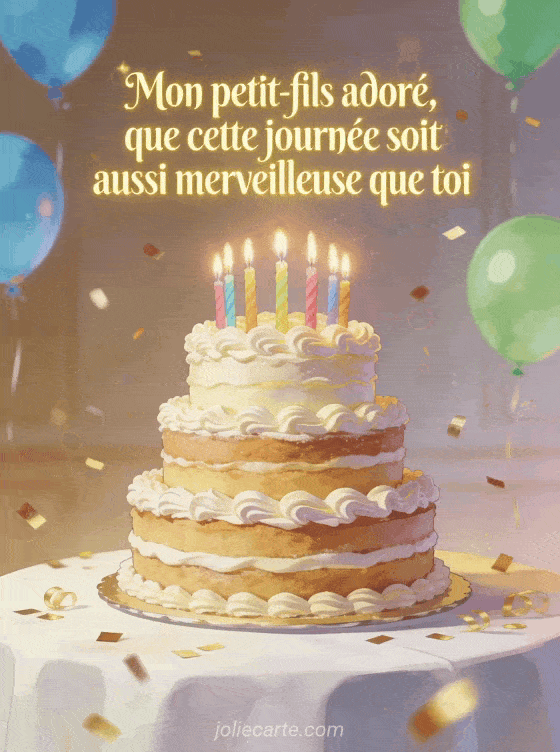 Offrez un petit mot plein d'amour Ă votre petit-fils pour cĂ©lĂ©brer son anniversaire. Cette carte illustrĂ©e d'un gĂąteau festif et de confettis dorĂ©s porte un message tendre qui touchera son cĆur.