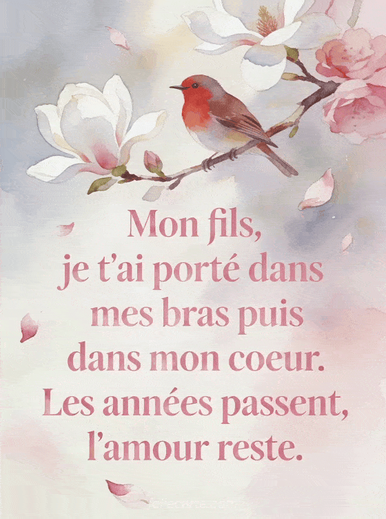 Offrez à votre fils ce poème d'une mère qui dit l'amour intemporel porté depuis sa naissance. Un rouge-gorge sur un magnolia en fleurs accompagne ces mots tendres. Découvrez aussi un poème champêtre, un poème lumineux ou une carte sagesse.