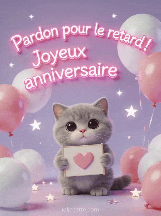 Ce chaton british shorthair avec ses ballons est parfait pour accompagner un sms d'anniversaire en retard. Voir aussi des vĆux retard fleuris, un gif retard humoristique ou une carte retard masculine.
