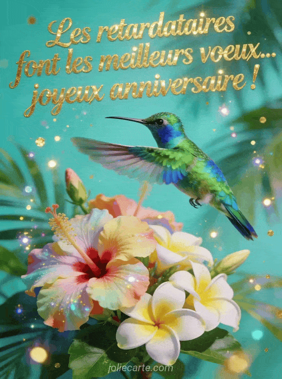 Ce colibri irisĂ© volant parmi les hibiscus porte vos vĆux d'anniversaire en retard avec Ă©clat. Voir aussi un retard fils sportif, un retard homme classe ou une photo retard gourmande.