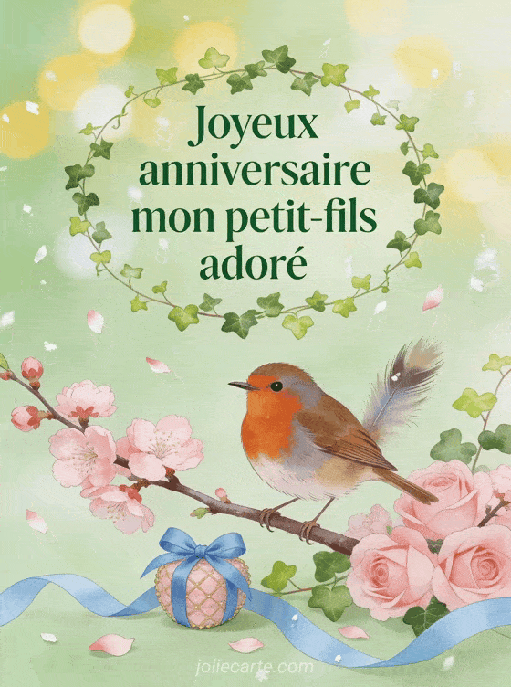 Envoyez un vĆu d'anniversaire printanier Ă votre petit-fils adorĂ© avec cette carte au rouge-gorge et cerisier en fleurs. ComplĂ©tez avec un souhait festif, un texte personnalisĂ© ou une lettre d'amour.