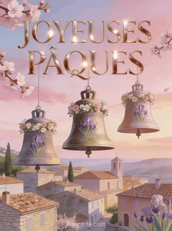 Partagez cette image « Joyeuses Pùques » avec ses cloches fleuries au-dessus d'un village provençal. Découvrez aussi une carte Pùques drÎle, une carte Pùques gratuite ou une jolie carte Pùques.