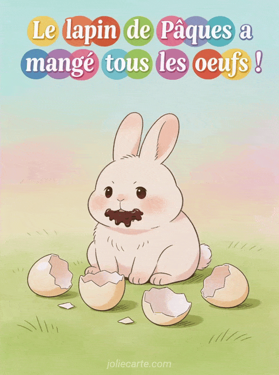 Partagez cette image humoristique de PĂąques avec son lapin gourmand pour faire sourire vos proches. Voyez aussi une carte lapin de PĂąques, une carte agneau pascal ou une image joyeuse PĂąques.