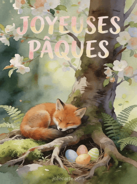 Partagez cette image « Joyeuses PĂąques » avec son renard endormi pour cĂ©lĂ©brer les fĂȘtes. DĂ©couvrez aussi une carte poule de PĂąques, une carte PĂąques ou un gif joyeuses PĂąques.