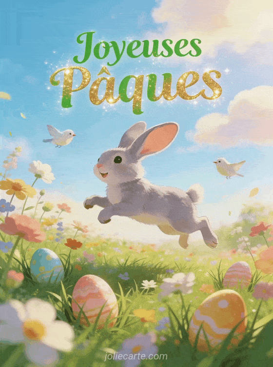 Envoyez cette adorable image de joyeuse PĂąques avec un lapin bondissant pour cĂ©lĂ©brer les fĂȘtes en toute gaietĂ©. Retrouvez aussi une photo d'oeufs de PĂąques, une image de lapin de PĂąques ou des animaux de PĂąques.