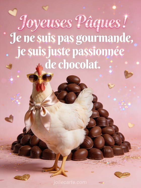 Joyeuses Pùques ! Je ne suis pas gourmande, je suis juste passionnée de chocolat. une carte joyeuses Pùques humour spéciale femme gourmande