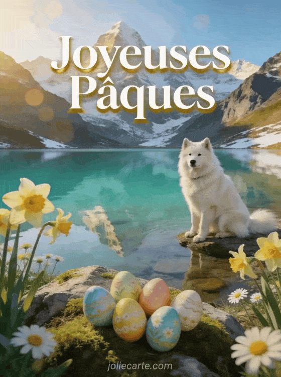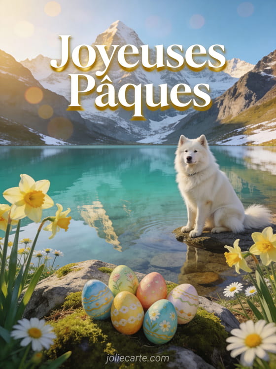 Partagez cette image de joyeuses PĂąques pour envoyer vos voeux dans un dĂ©cor de lac de montagne printanier. DĂ©couvrez aussi une image joyeuse fĂȘte de PĂąques, une carte de PĂąques gratuite ou une carte de voeux PĂąques.