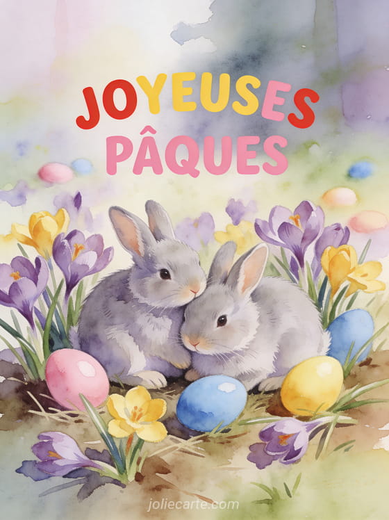 Joyeuses PĂąques deux lapins blottis parmi les crocus