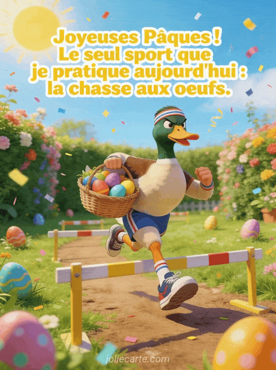 Faites rire vos proches avec ce Pùques humour gif mettant en scÚne une chasse aux oeufs sportive et décalée. Découvrez aussi un bon dimanche de Pùques humour, un lapin de Pùques humour ou un lapin de Pùques rigolo.