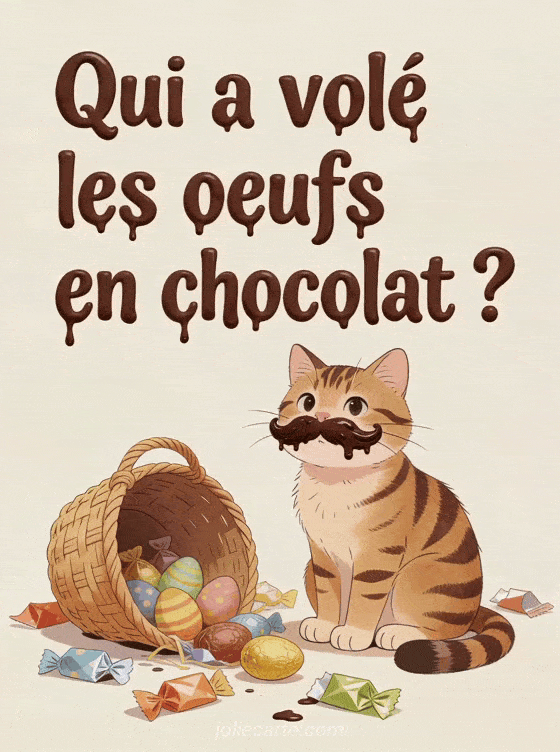 Partagez cette image drĂŽle « Qui a volĂ© les Ćufs en chocolat ? » pour des PĂąques amusantes. Voyez aussi une carte bonne fĂȘte humour, une carte Ćuf de PĂąques ou un gif de PĂąques.